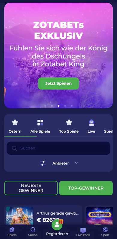 ZotaBet ist eine dynamische Online-Glücksspielplattform, die 2022 gegründet wurde und seit ihrer Einführung eine beeindruckende Fangemeinde aufgebaut hat. Dieses Casino vereint über 3.500 Spielautomaten, Live-Dealer-Spiele und ein umfangreiches Sportwettenangebot unter einem Dach. Für neue Spieler aus Deutschland wartet ein sagenhafter Willkommensbonus von bis zu 10.000€ mit 725 Freispielen – kein anderes Casino bietet derzeit ähnlich attraktive Einstiegsbedingungen. Mit einem täglichen Cashback von bis zu 20% und einem VIP-Programm für Highroller ist ZotaBet weit mehr als ein gewöhnliches Online-Casino. Melden Sie sich noch heute an und sichern Sie sich Ihren exklusiven Bonus!